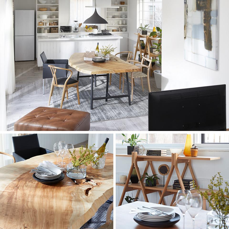 友人からも褒められるテーブルは、こだわり抜いて選んだ二つとない杢目が表情豊かでお気に入りの一枚板テーブル。
