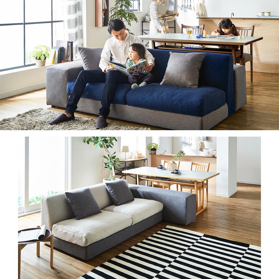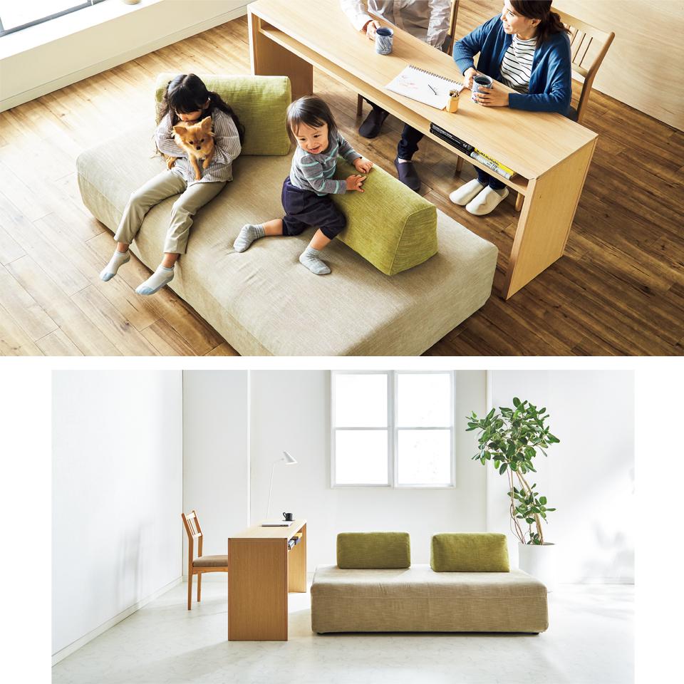 限られたスペースを有効活用できるソファ「ポーター」。ダイニングとリビングをまとめ、