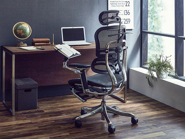 「エルゴヒューマン」 - 腰へのフィット感とサポートに重点を置いて設計・デザインされたチェアブランド。座面の前後・上下、リクライニング調整がレバー1本で直感的に行えます。