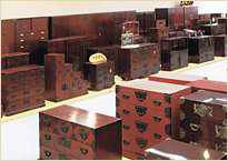 欅の木目が映える“漆”を塗る作業。平均半月以上という時間を掛け、最も手数のかかる工法をかたくなに守っているのは、時の経過とともに、欅の木目が一層その鮮明さを増し、独特の深みがだせるのは「漆」しかないからです。仙台民芸箪笥には、3種類の塗りがあります。刷毛で塗っては布で磨く「拭き漆」、漆に朱の顔料を加えた鮮やかな「朱塗り」、そして、一名「馬鹿塗り」とも云われるほど漆を塗っては研ぎ出し、また塗っては研ぐという工程を何度も何度も繰り返えす「木地呂塗り」。伝統的な塗り方で塗表面が厚く、欅の木目が一層引き立ちます。時の経過とともに、透明感が増し、欅の木目が一層鮮やかに浮かび出て化学塗料では表現し得ない風合いを出します。