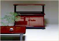 漆家具は、日本が世界に誇る特有の工芸として、海外では「ジャパン」と呼ばれています。漆の代表格である黒漆ほか、朱漆、飴色の透明感が特徴の溜塗がよく親しまれています。漆を何度も塗り重ね、研ぎ、磨くことにより、生まれる色と形。