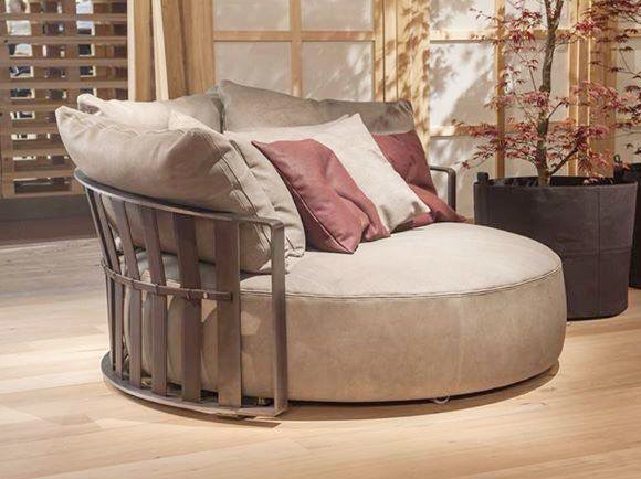 ソファはくつろぐ為のインテリアということを具現化した作品。座るだけでなく寝転んだり出来るようにラウンド型にデザインされています。また、ソファ本体が回転することにより夜景を見たりテレビを見たりと様々な用途に使用することが出来ます。