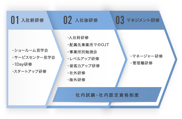 さらに、ショールームのマネージャー、管理職、営業サポート部門、本社各部門、サービスセンター、工房スタッフ等においても、日々の実務に必要な知識の習得をはじめ、社員自身の向上心を高め、その熱意を応援する体制を整えています。