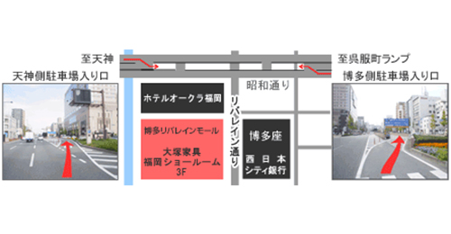 • 一度一般道路へ降り都市高速へ、天神方面と空港方面の分岐を左(空港方面へ)分岐してすぐの呉服町ランプを出て昭和通へ、直進後中央分離帯側入口から地下駐車場へ